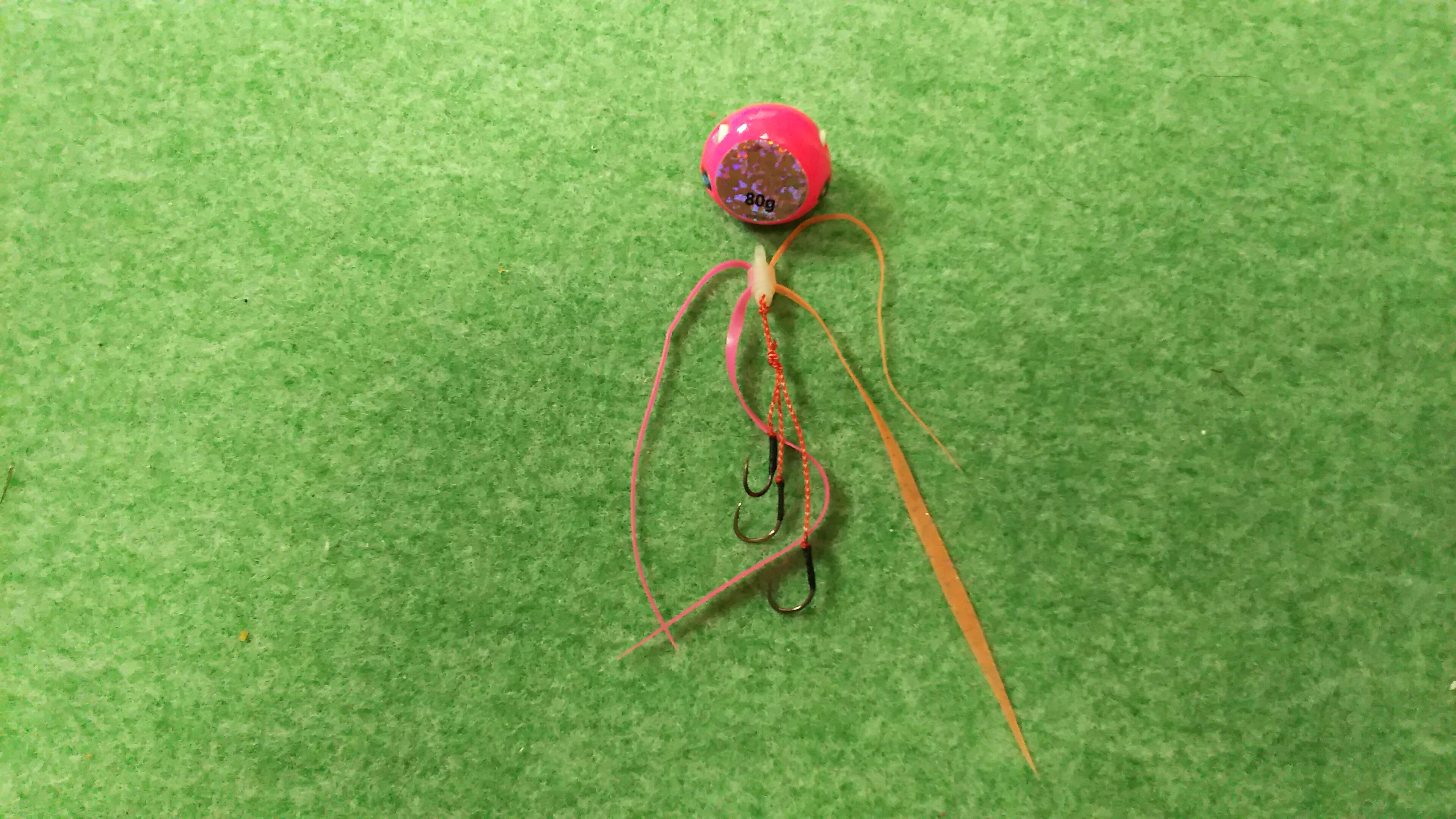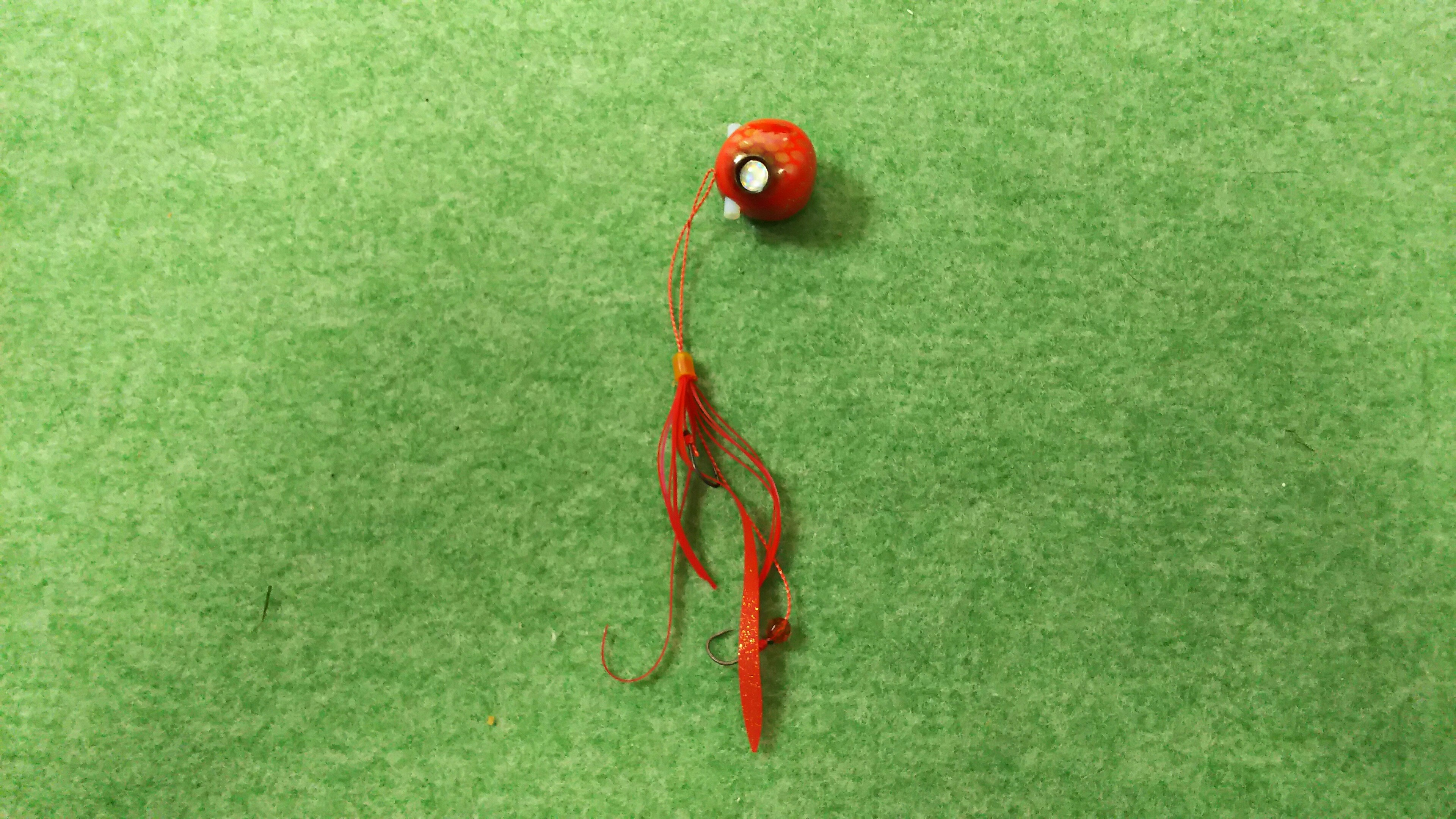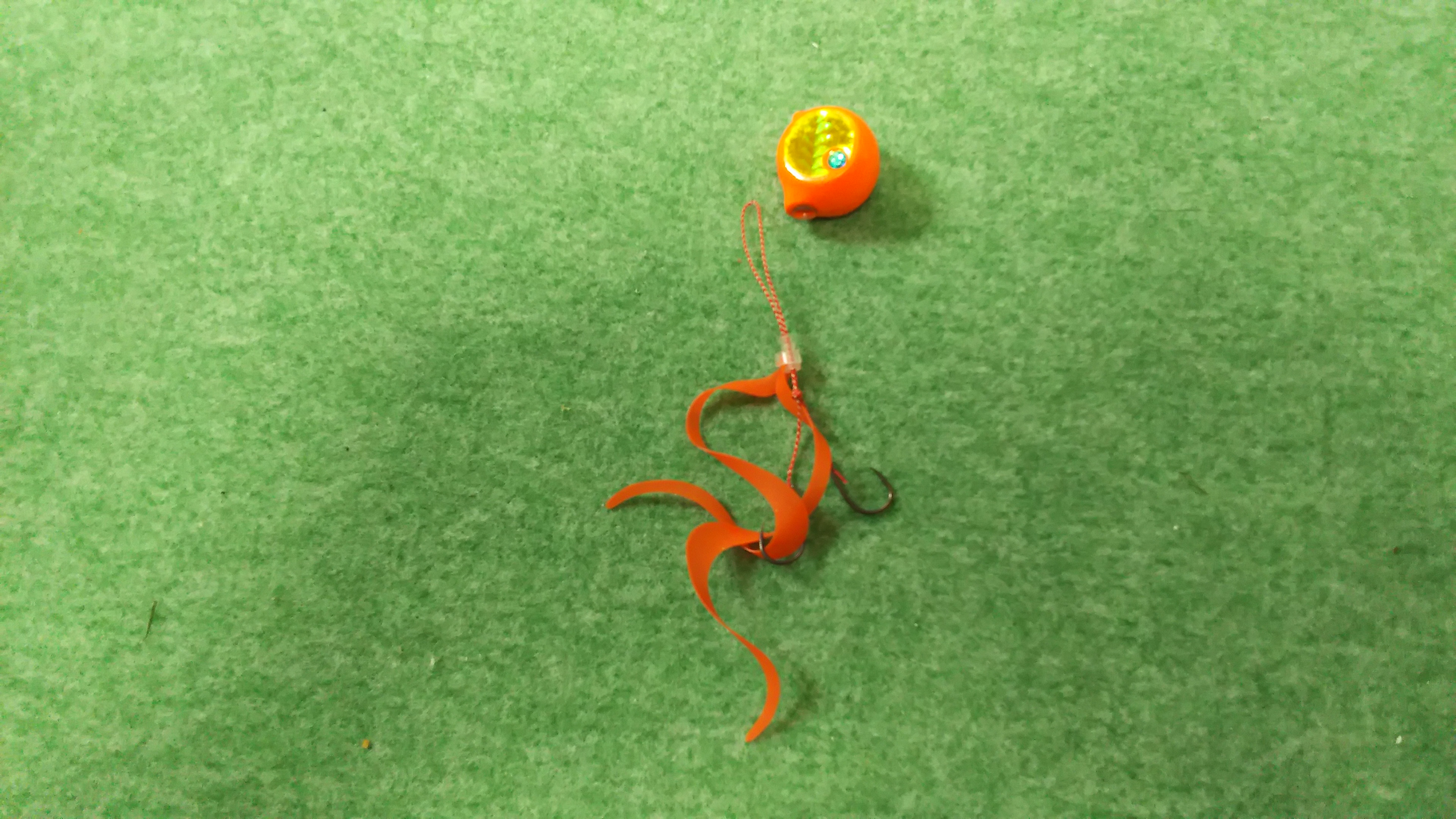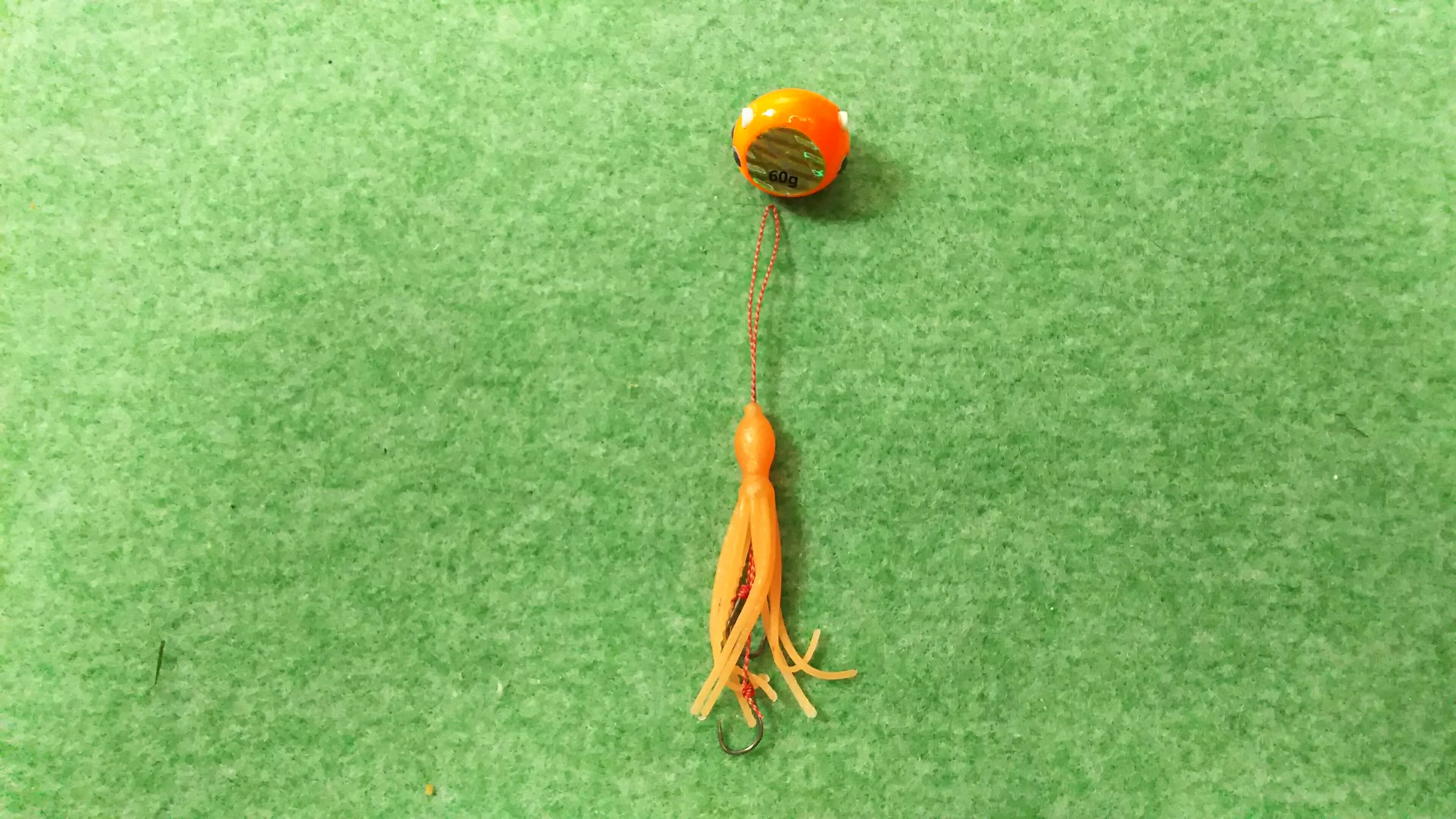 今日は中潮で、満潮は7時頃でした。最初は潮があまり動かず縦の釣りになりました。先日準備したオレンジ色のタコベイトを、紅牙のオレンジ玉60gとともに使ったところ、アタリが出はじめ、2匹釣ることができました。