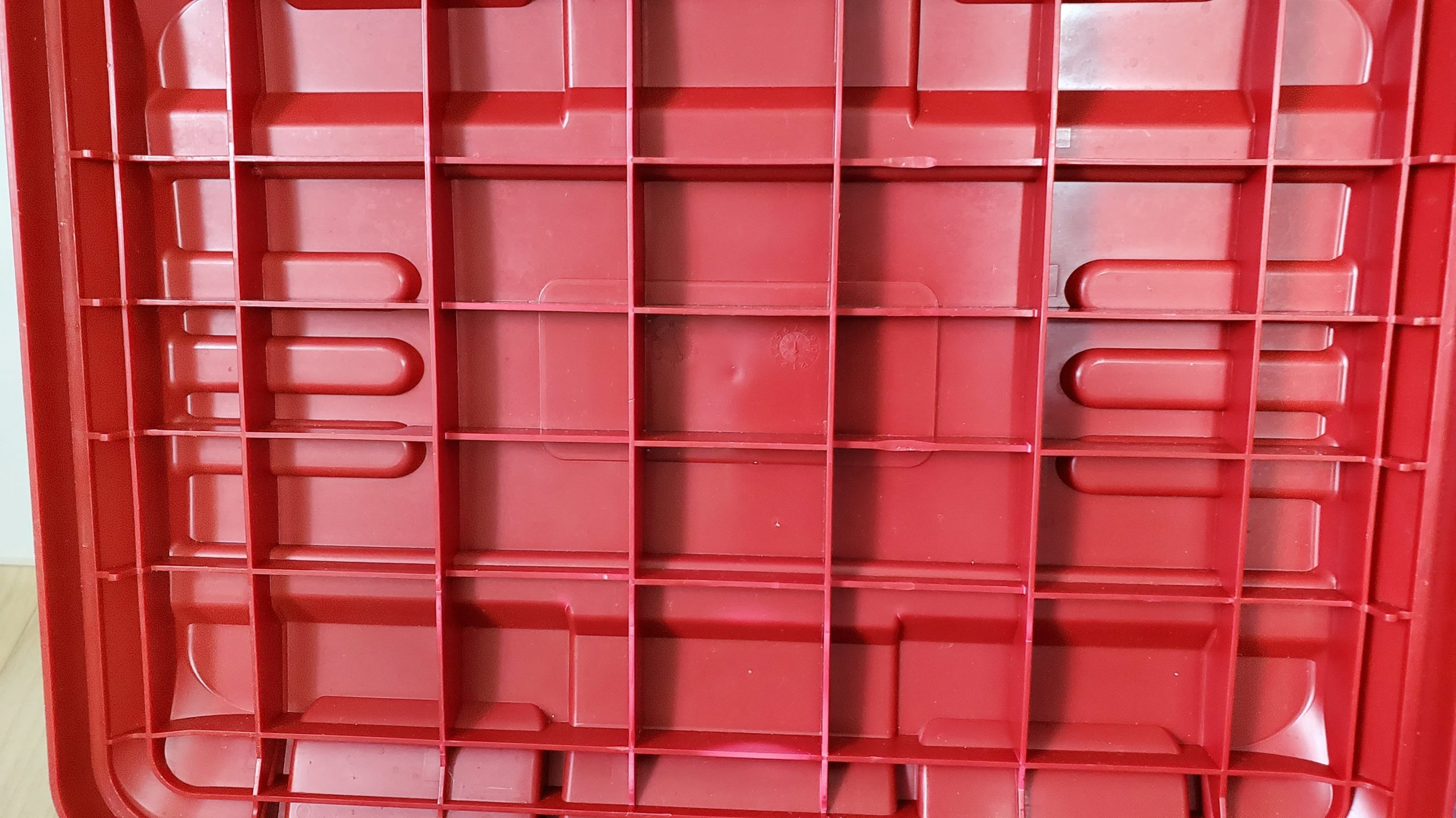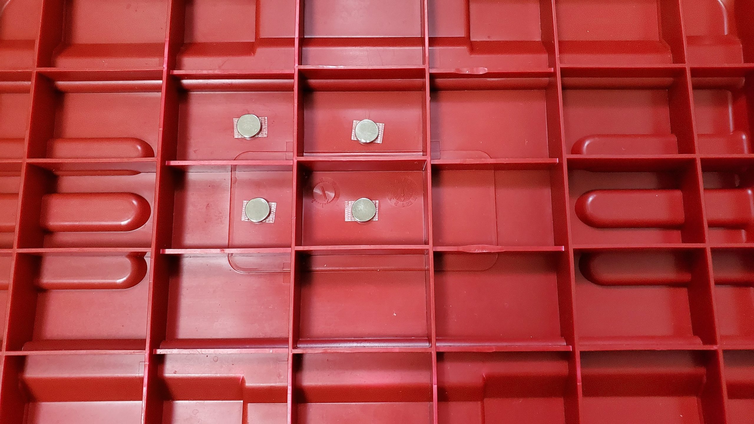 家に帰り作業開始。まず、タックルボックスの蓋の裏に、両面テープで強力磁石を貼り付けます。蓋の真ん中あたりの仕切り1つに磁石1つを設置。
