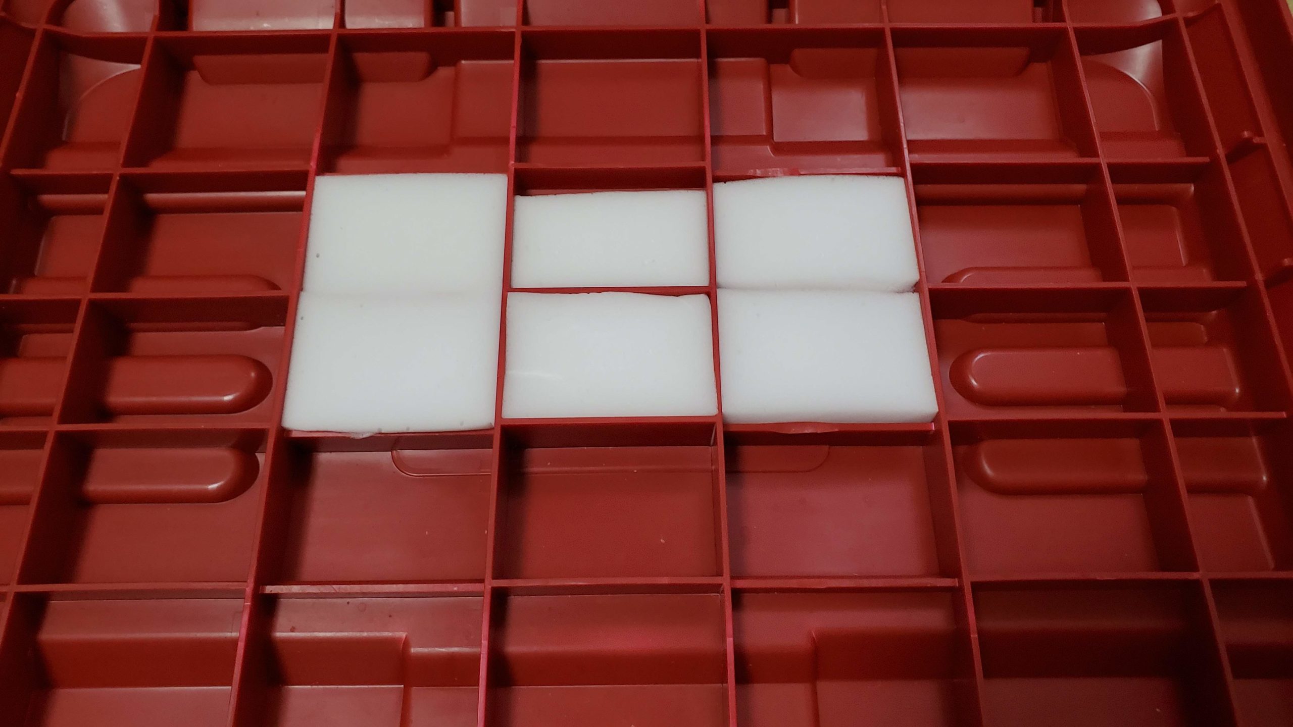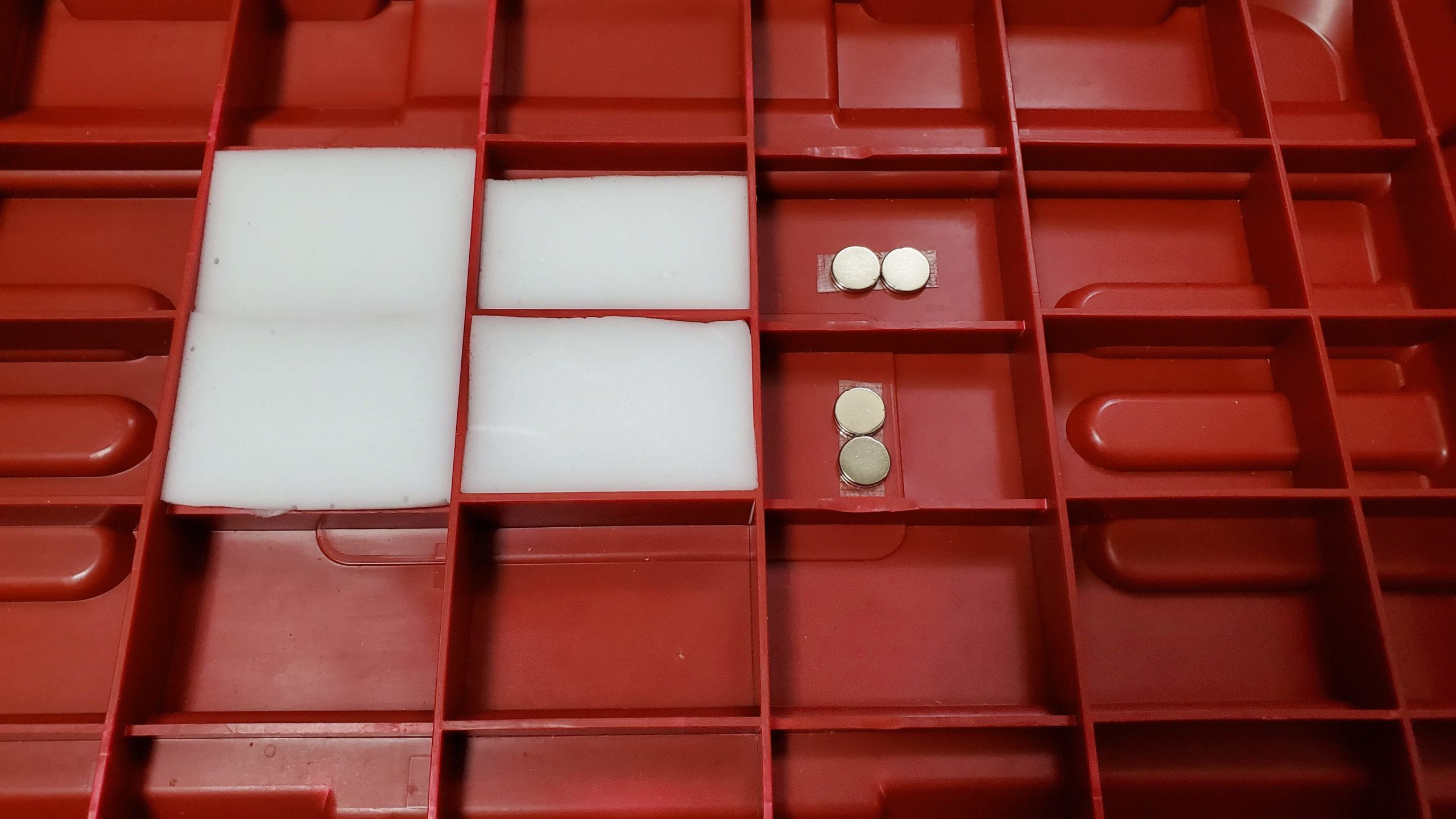 その後、半分の厚さにカットしておいたスポンジを、仕切りの大きさに切って詰めました。これで磁石を固定することができました。